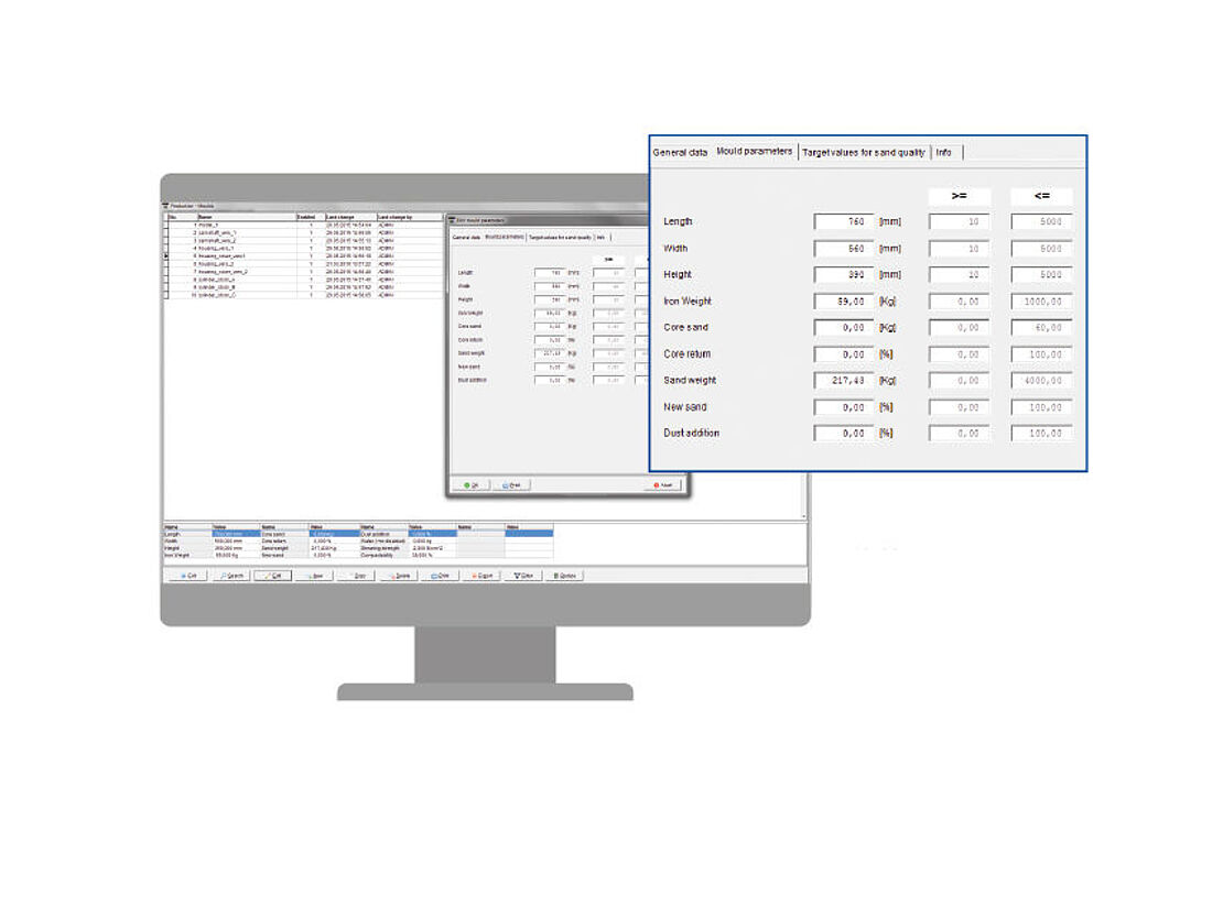 Der Funktionsumfang des AT1 Profi bietet Ihnen die volle Kontrolle über die zentralen Leistungsmerkmale und damit eine umfassende Qualitätssicherung bei Ihrer Formstoffaufbereitung. Für beide Größen - Verdichtbarkeit und Scherfestigkeit - werden pro Charge bis zu drei Messwerte ermittelt.